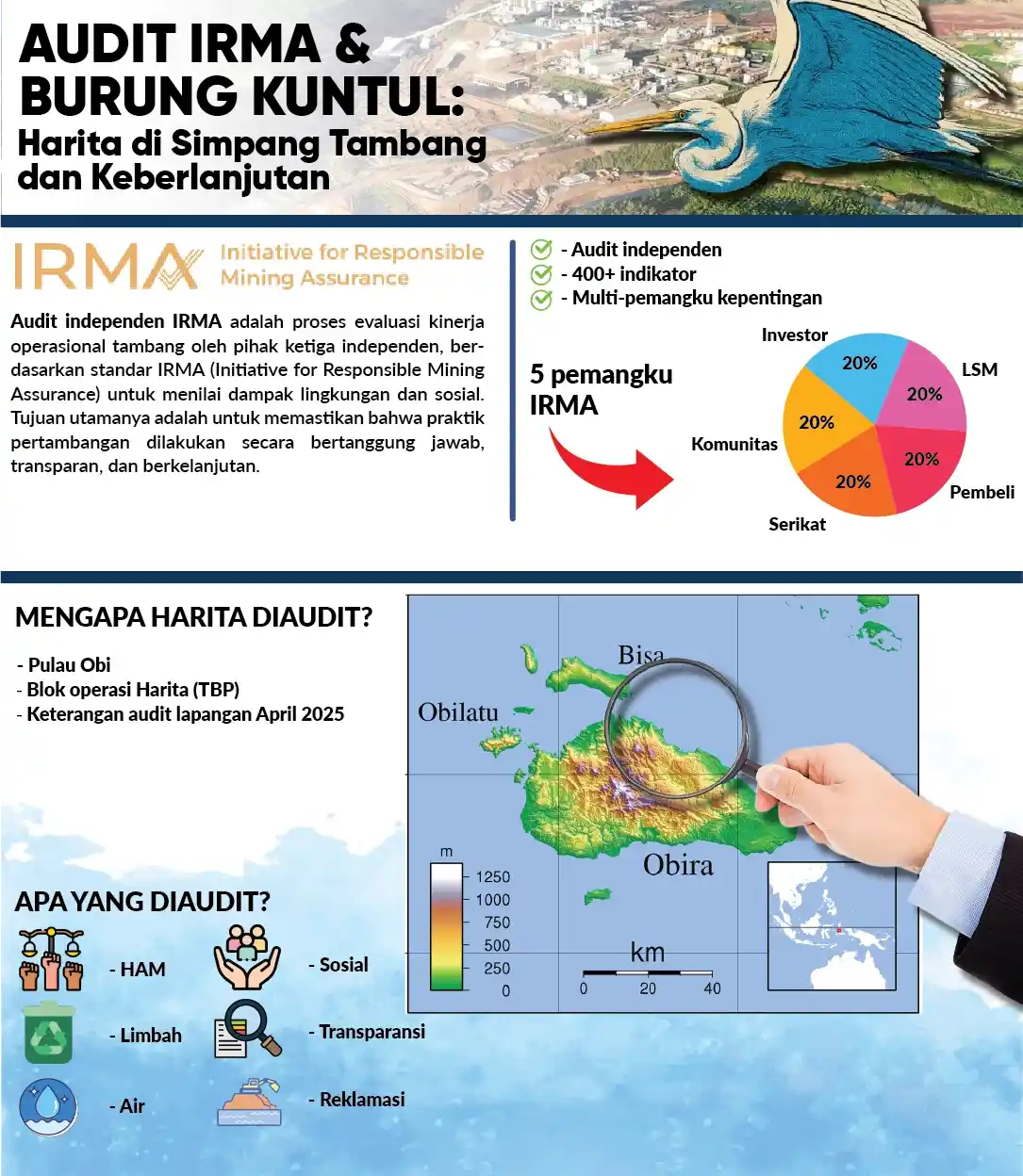 Laporan keberlanjutan Harita 2024 juga menyatakan bahwa proses pengumpulan data lapangan untuk IRMA didampingi oleh pihak internal ESG dan tim eksternal independen yang telah dilatih sesuai prosedur IRMA.