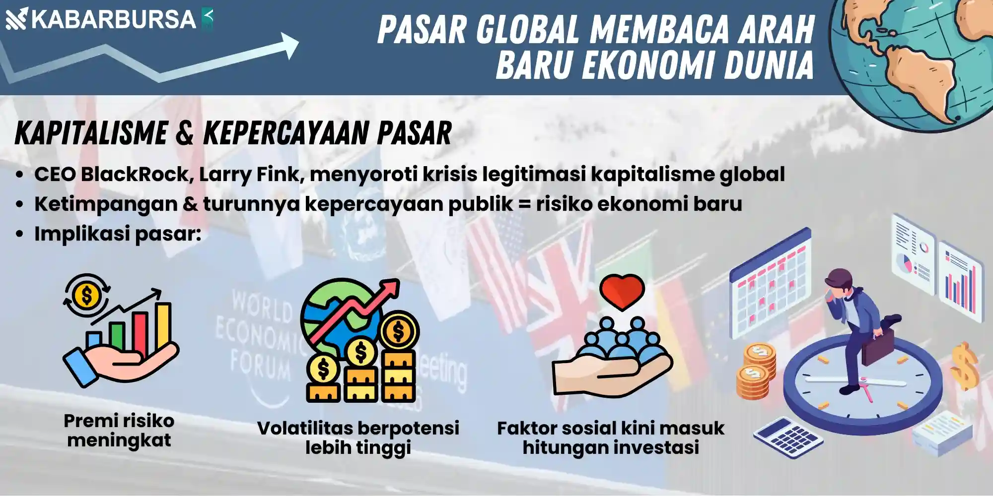 Hari kedua WEF memperlihatkan bahwa diskusi tentang ekonomi global tidak lagi berhenti pada angka pertumbuhan. Larry Fink, CEO BlackRock, secara terbuka menyampaikan bahwa kapitalisme global menghadapi tantangan legitimasi. Ketimpangan yang melebar dan kepercayaan publik yang menurun berpotensi menjadi sumber risiko ekonomi jangka menengah.