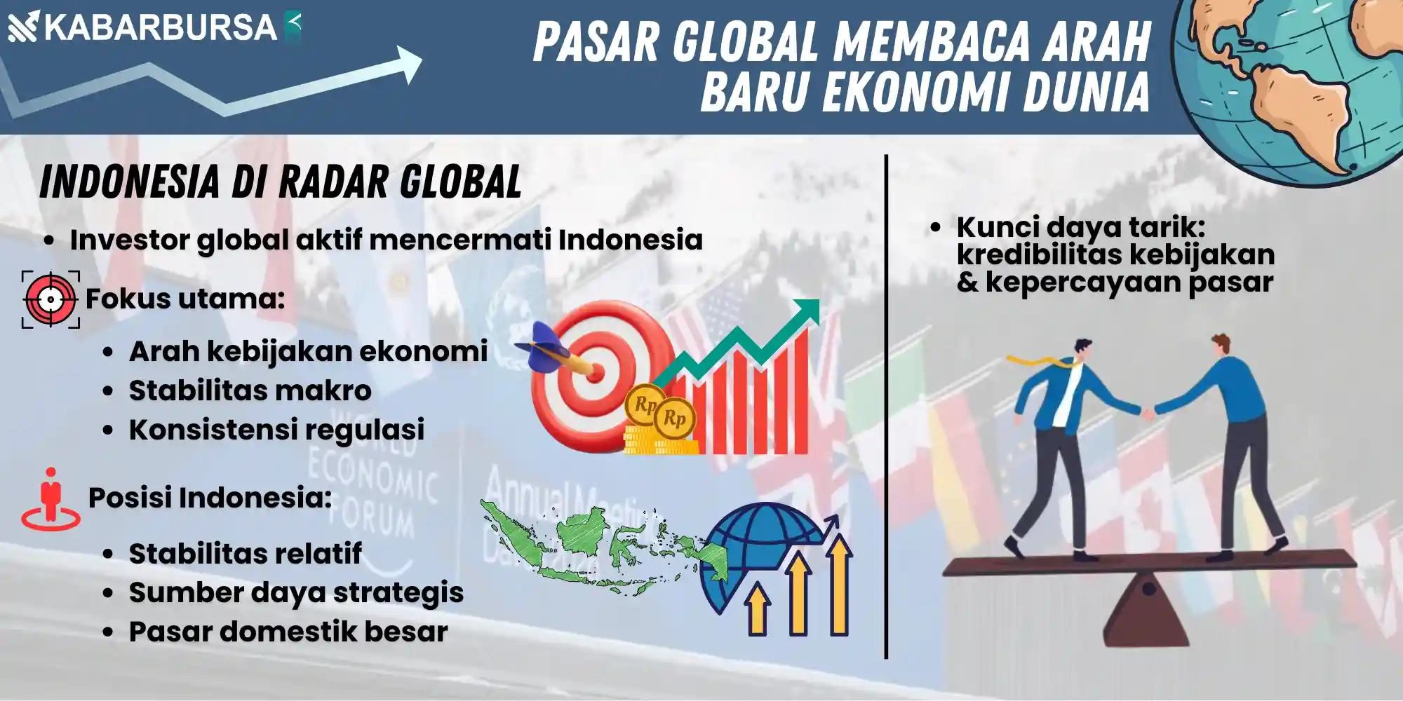 Bagi pasar, Indonesia berada pada posisi yang menarik. Di satu sisi, risiko global meningkat. Di sisi lain, negara dengan stabilitas relatif, sumber daya strategis, dan pasar domestik besar tetap memiliki daya tarik jangka panjang.