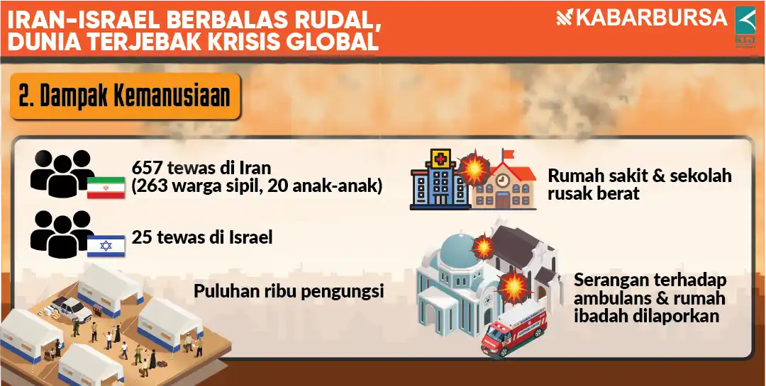 Serangan udara menghantam infrastruktur vital di Iran dan Israel. Rumah sakit, sekolah, kawasan permukiman di Teheran, Isfahan, hingga Haifa mengalami kerusakan parah. Di Iran, setidaknya 263 warga sipil tewas hanya dalam serangan perdana Israel. Organisasi ICRC menyebut konflik ini sebagai “tragedi sipil yang membahayakan keseluruhan hukum humaniter internasional”.