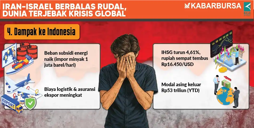Nilai tukar rupiah sempat menyentuh Rp16.450 per USD, level terendah sejak 2020. BI mencatat arus keluar modal asing sebesar Rp2,04 triliun dalam waktu empat hari perdagangan. Ketika kabar gencatan senjata sempat mencuat, rupiah menguat ke Rp16.381, tetapi tetap fluktuatif karena ketidakpastian geopolitik belum mereda.