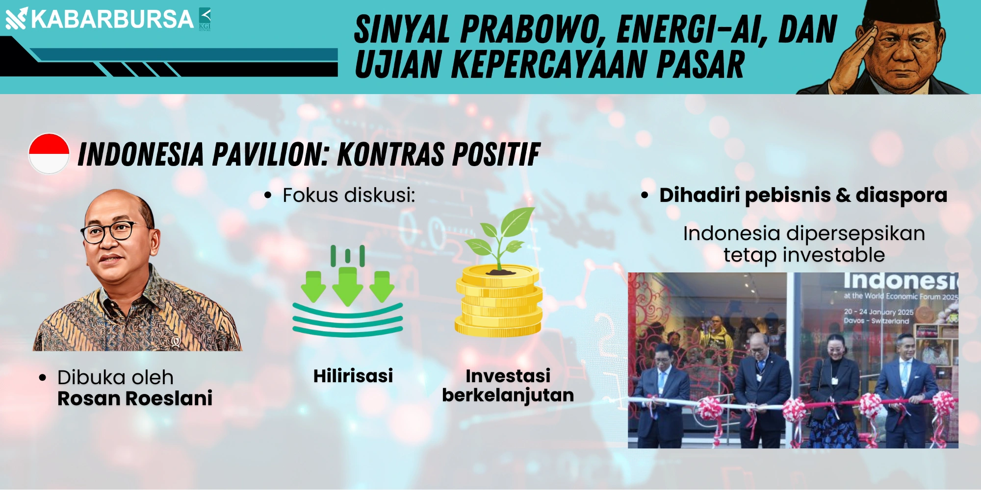 Indonesia Pavilion—dibuka oleh Rosan Roeslani—memberi kontras positif. Diskusi tentang hilirisasi dan investasi berkelanjutan menunjukkan konsistensi agenda Indonesia. Kehadiran pebisnis dan diaspora memperkuat persepsi bahwa Indonesia tetap investable di tengah gejolak global.