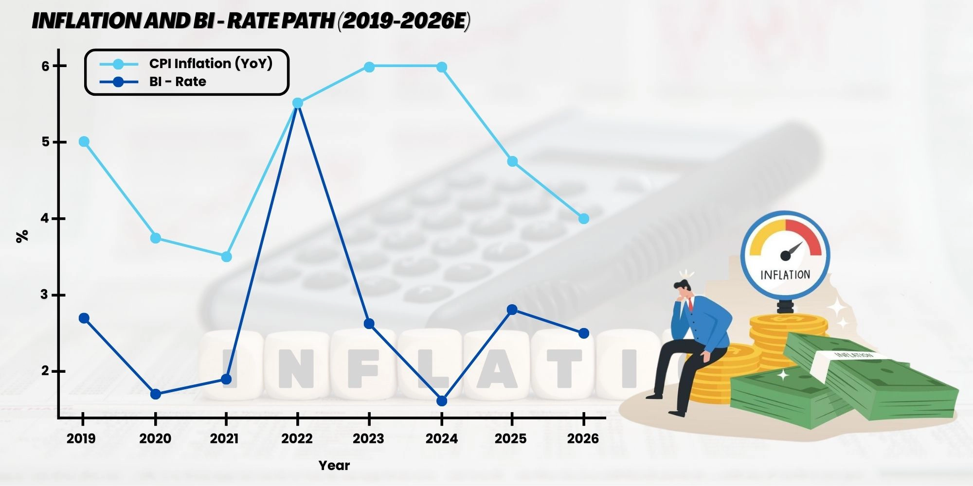 Bagi pasar modal, kombinasi inflasi dan suku bunga adalah ‘harga modal’ (cost of capital). Bank Indonesia menyatakan inflasi 2025–2026 diproyeksikan tetap dalam koridor target 2,5 persen±1 persen. Pada rapat Oktober–November 2025, BI menahan BI-Rate di 4,75 persen—memberi sinyal stabilitas di tengah volatilitas global. Proyeksi BCA menempatkan BI-Rate 2026 pada 4,0 persen (baseline), dengan skenario rentang 3,5 persen–4,75 persen tergantung kondisi global dan domestik.