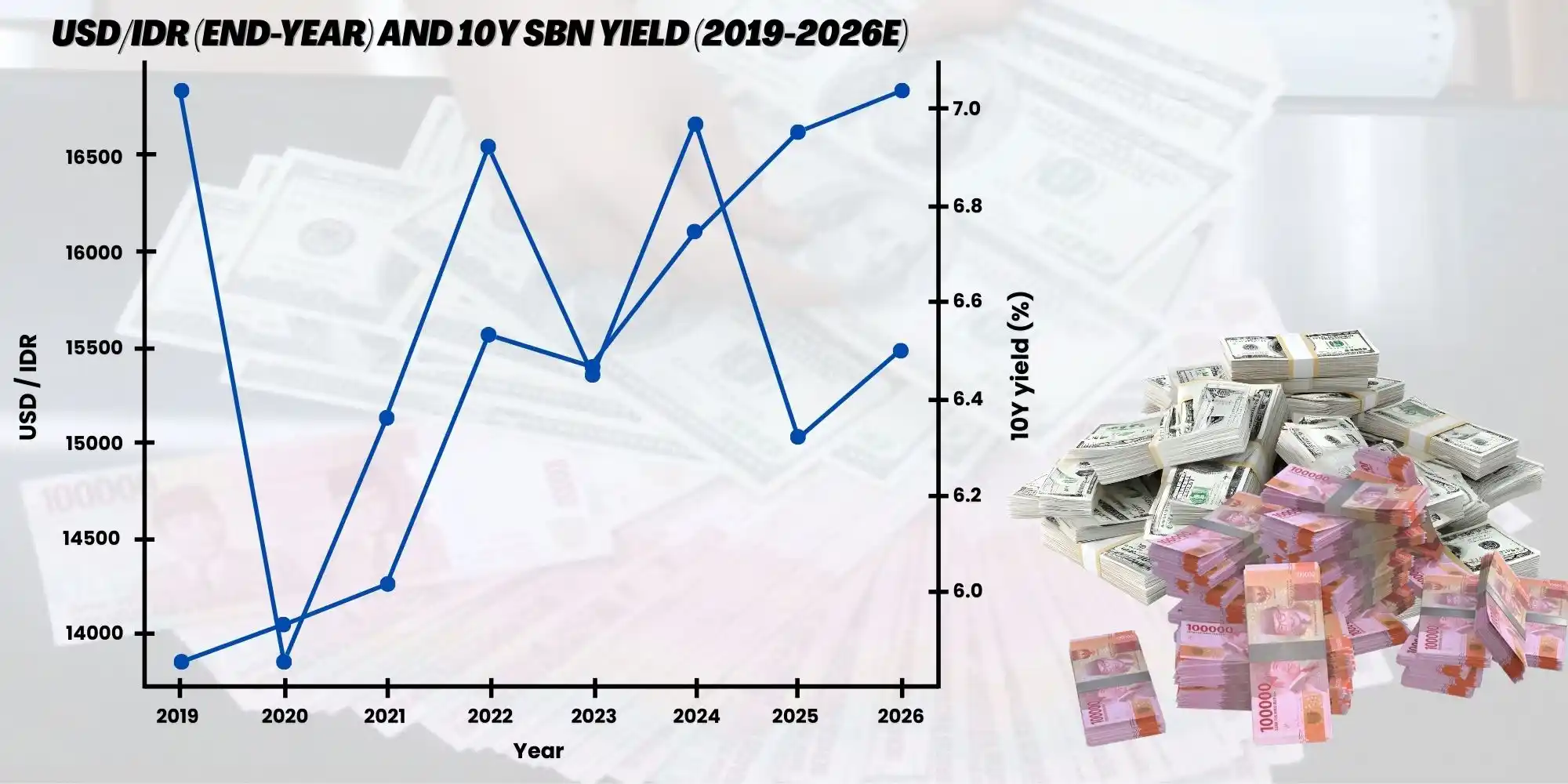 Di 2026, valuasi saham Indonesia akan sangat dipengaruhi oleh stabilitas rupiah dan level yield SBN. BCA memproyeksikan USD/IDR akhir 2026 sekitar 16.842 (baseline) dan yield SBN 10Y sekitar 6,5 persen. Sementara itu, data pasar obligasi menunjukkan yield SBN 10 tahun berada sekitar 6,12 persen per 31 Desember 2025. Keduanya menjadi ‘benchmark’ bagi investor untuk menilai premi risiko ekuitas (equity risk premium).