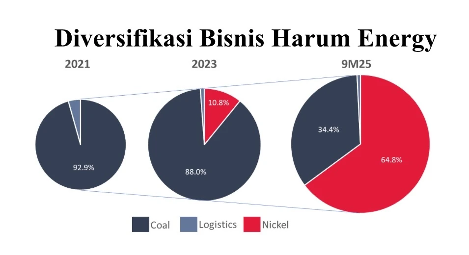 Data terbaru menunjukkan kontribusi batu bara terhadap pendapatan Harum Energy menyusut tajam. Jika pada 2023 porsinya mencapai 88 persen, pada 2025 tinggal sekitar 34,4 persen. Artinya, dalam tempo singkat perusahaan mulai memindahkan pusat gravitasinya ke sektor lain.