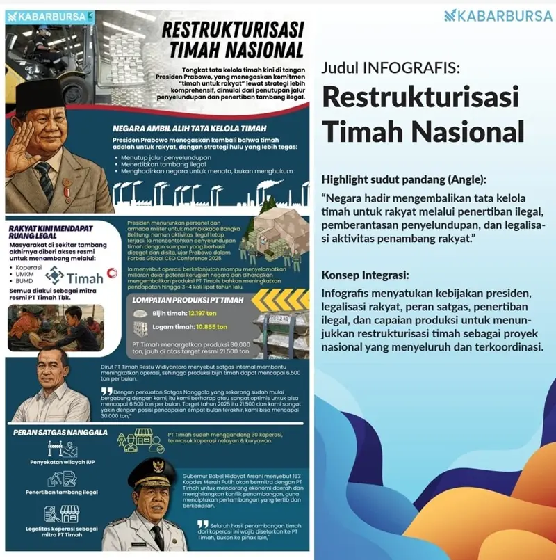 Selain keputusan Prabowo, infografis juga menyertakan kutipan dari Direktur Utama PT Timah Tbk sebagai anggota grup MIND ID, Restu Widyantoro dan Gubernur Bangka Belitung Hidayat Arsani.