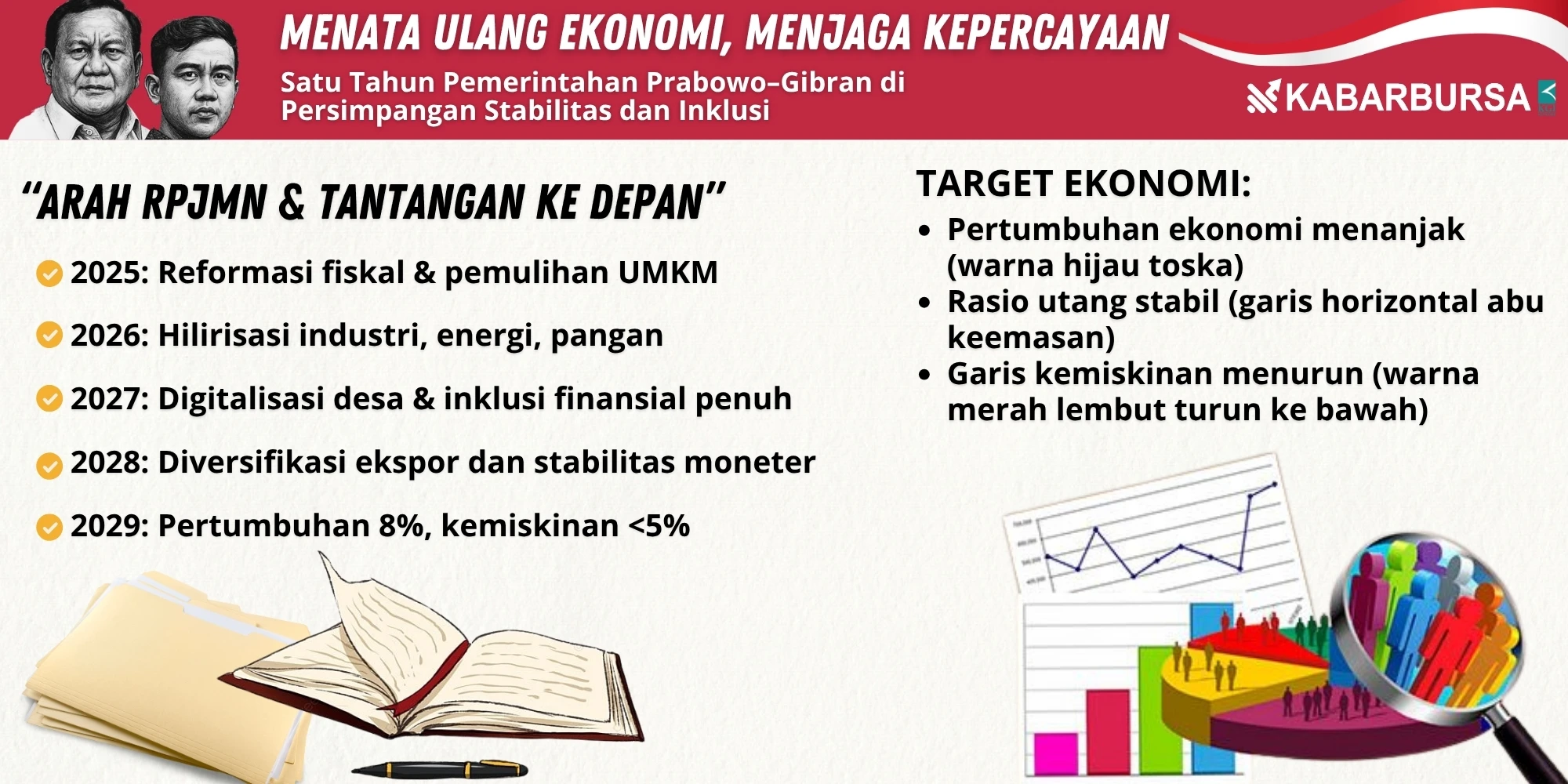 Di sisi makrostrategis, peluncuran RPJMN 2025–2029 menjadi peta jalan pembangunan paling ambisius dalam dua dekade terakhir. Melalui konsep Asta Cita Pembangunan Nasional, pemerintah menargetkan pertumbuhan ekonomi 8 persen pada 2029, kemiskinan di bawah 5 persen, dan rasio utang tetap stabil di kisaran 39 persen PDB.