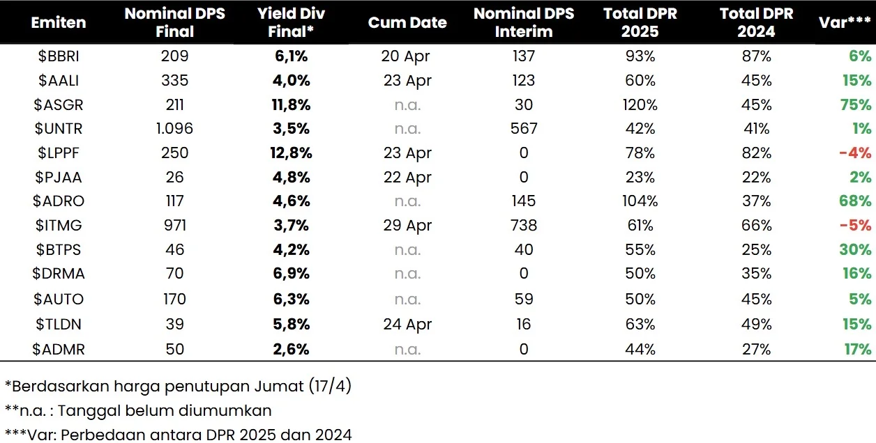 Secara keseluruhan, data ini menunjukkan bahwa musim dividen tahun ini tidak hanya soal besaran, tetapi juga strategi perusahaan dalam menyeimbangkan kebutuhan ekspansi dan distribusi laba. Di tengah ketidakpastian ekonomi global, dividen tetap menjadi salah satu instrumen utama untuk menjaga daya tarik saham di mata investor.(*)