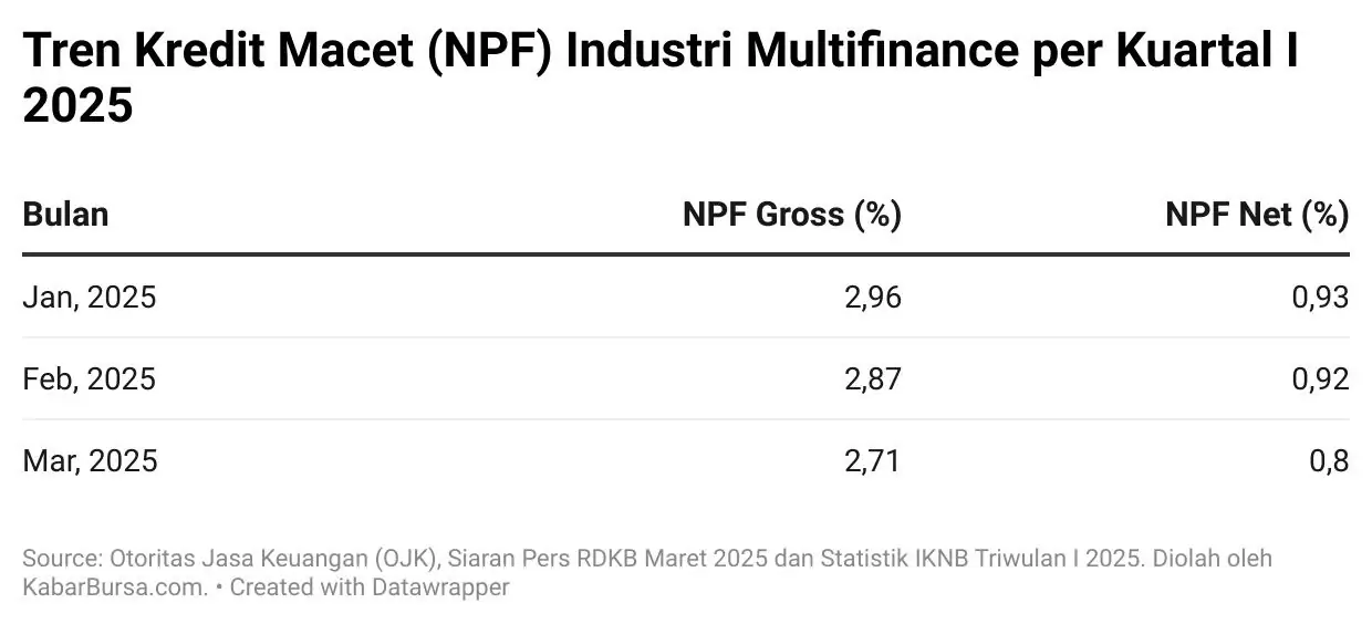 Per Maret 2025, Otoritas Jasa Keuangan (OJK) mencatat nilai piutang pembiayaan multifinance mencapai Rp510,97 triliun tumbuh 4,6 persen secara tahunan. Angka ini disokong oleh lonjakan pembiayaan modal kerja sebesar 11,07 persen. Sementara dari sisi risiko, industri ini masih terkendali, antara lain rasio Non-Performing Financing (NPF) gross turun ke 2,71 persen dan NPF net hanya 0,80 persen. Gearing ratio industri multifinance pun terjaga di level 2,26 kali, jauh di bawah ambang batas OJK sebesar 10 kali.