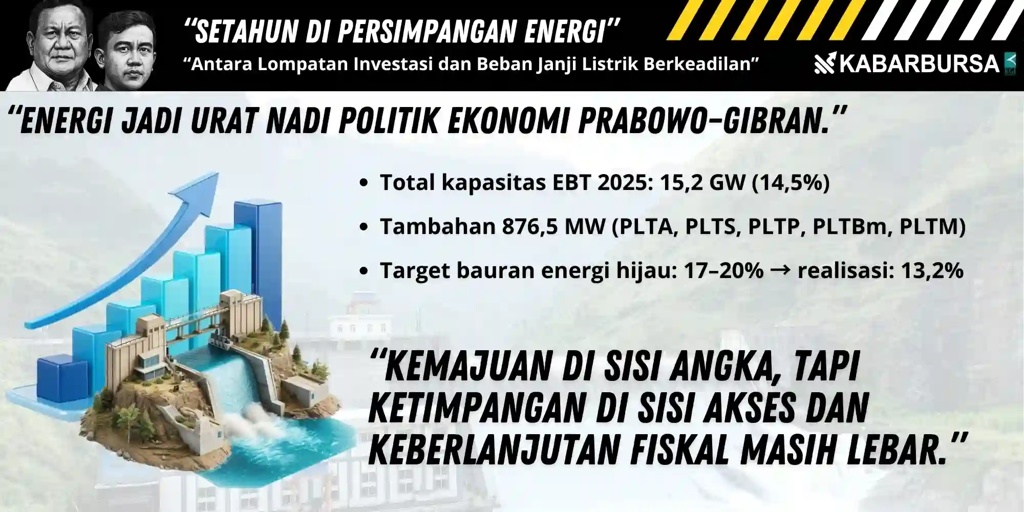 KABARBURSA.COM - Satu tahun pertama pemerintahan Prabowo Subianto–Gibran Rakabuming Raka menempatkan sektor energi sebagai panggung besar pertaruhan kebijakan. Dari nikel hingga listrik rumah tangga, dari hilirisasi industri hijau hingga subsidi LPG 3 kilogram, energi adalah urat nadi politik ekonomi yang menentukan arah masa depan republik.