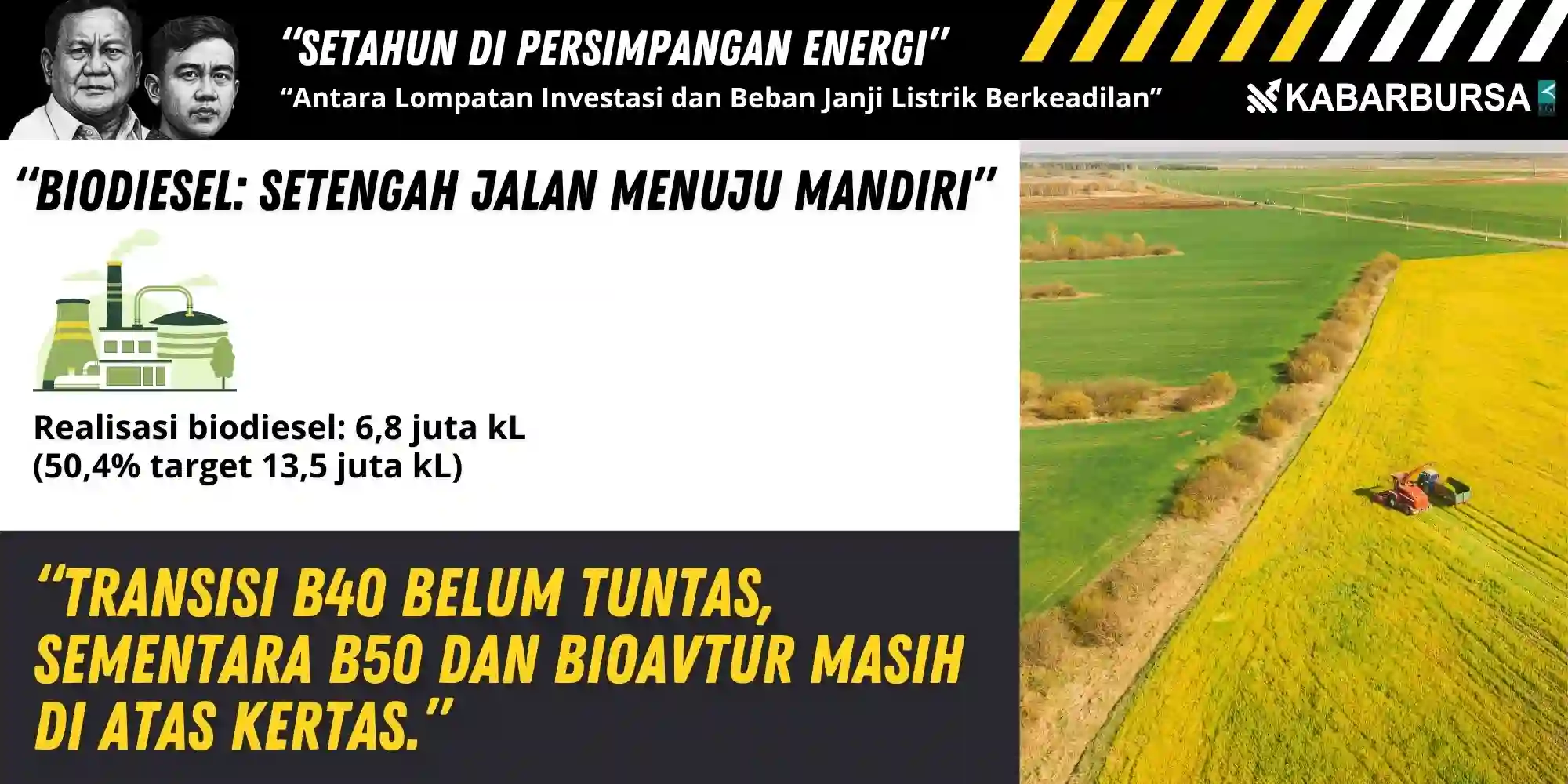 Sementara itu, di sisi lain rantai energi, kebijakan biodiesel juga belum sepenuhnya menjanjikan kemandirian energi berbasis nabati. Realisasi penyerapan biodiesel semester I baru mencapai 6,8 juta kiloliter—sekitar separuh target tahunan. Hambatan logistik, distribusi, dan kesiapan teknologi menahan laju implementasi B40, sementara wacana B50 dan bioavtur masih sebatas pilot project.