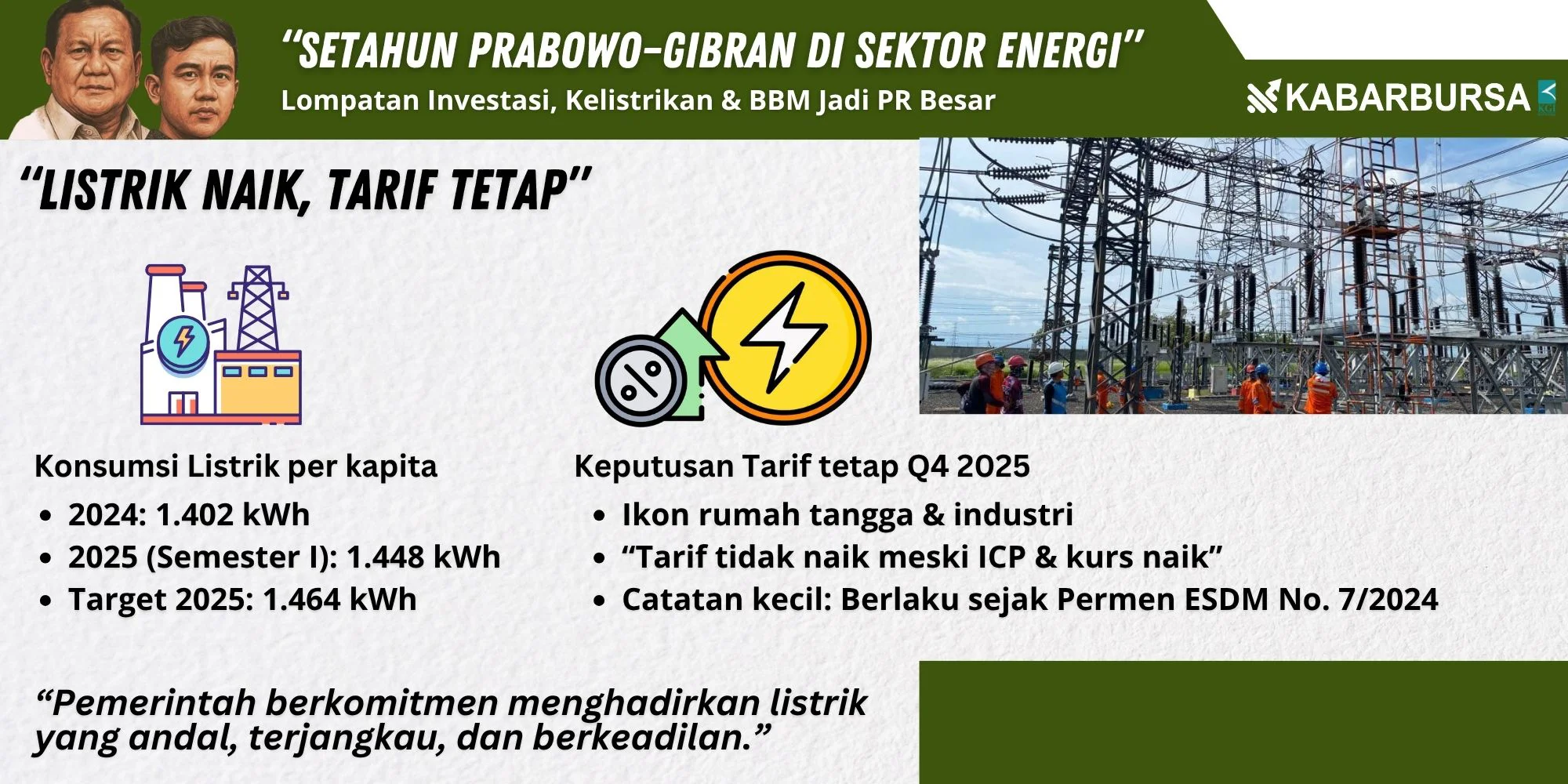 “Pemerintah berkomitmen menghadirkan listrik yang andal, terjangkau, dan berkeadilan. Dengan mempertahankan tarif listrik hingga akhir tahun ini, kami ingin memberikan kepastian dan menjaga stabilitas bagi masyarakat serta dunia usaha,” ungkap Tri.