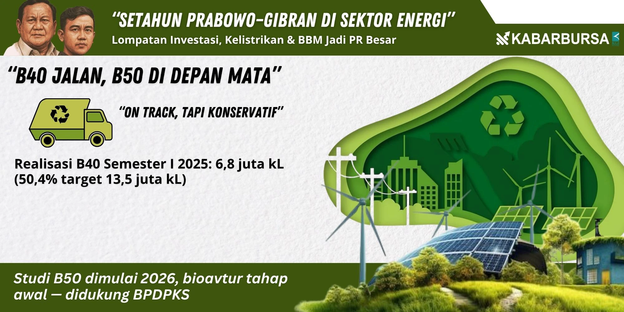 Ke depan, pemerintah menyiapkan eskalasi bauran melalui studi B50 pada 2026 dan pengembangan bioavtur skala awal. Skema pembiayaan mandatori—antara lain melalui dukungan BPDPKS—tetap diproyeksikan menopang distribusi biodiesel tahun berjalan.