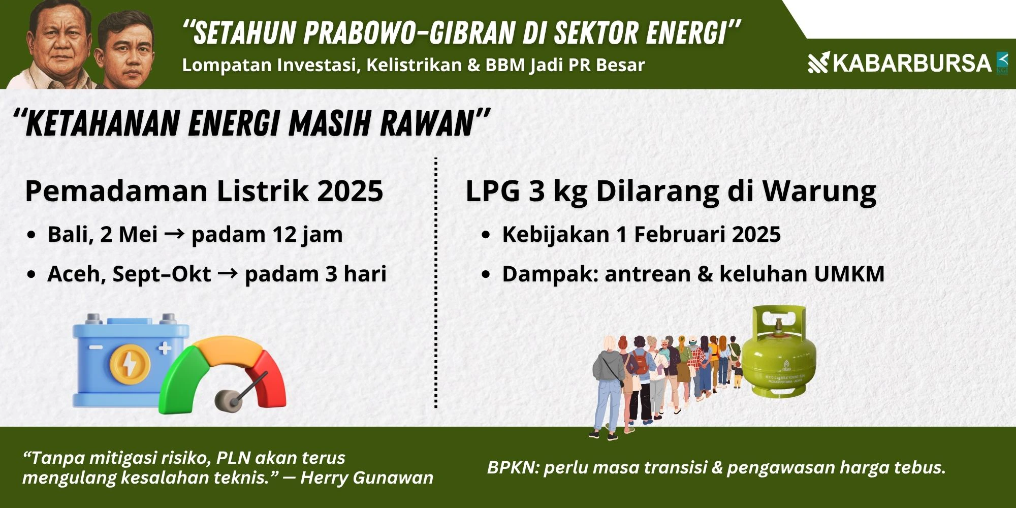 Di sisi lain, satu tahun pemerintahan Prabowo Subianto–Gibran Rakabuming di sektor energi diwarnai sejumlah catatan kurang memuaskan. Hal pertama yang menjadi sorotan masyarakat ialah pemadaman massal di Bali.