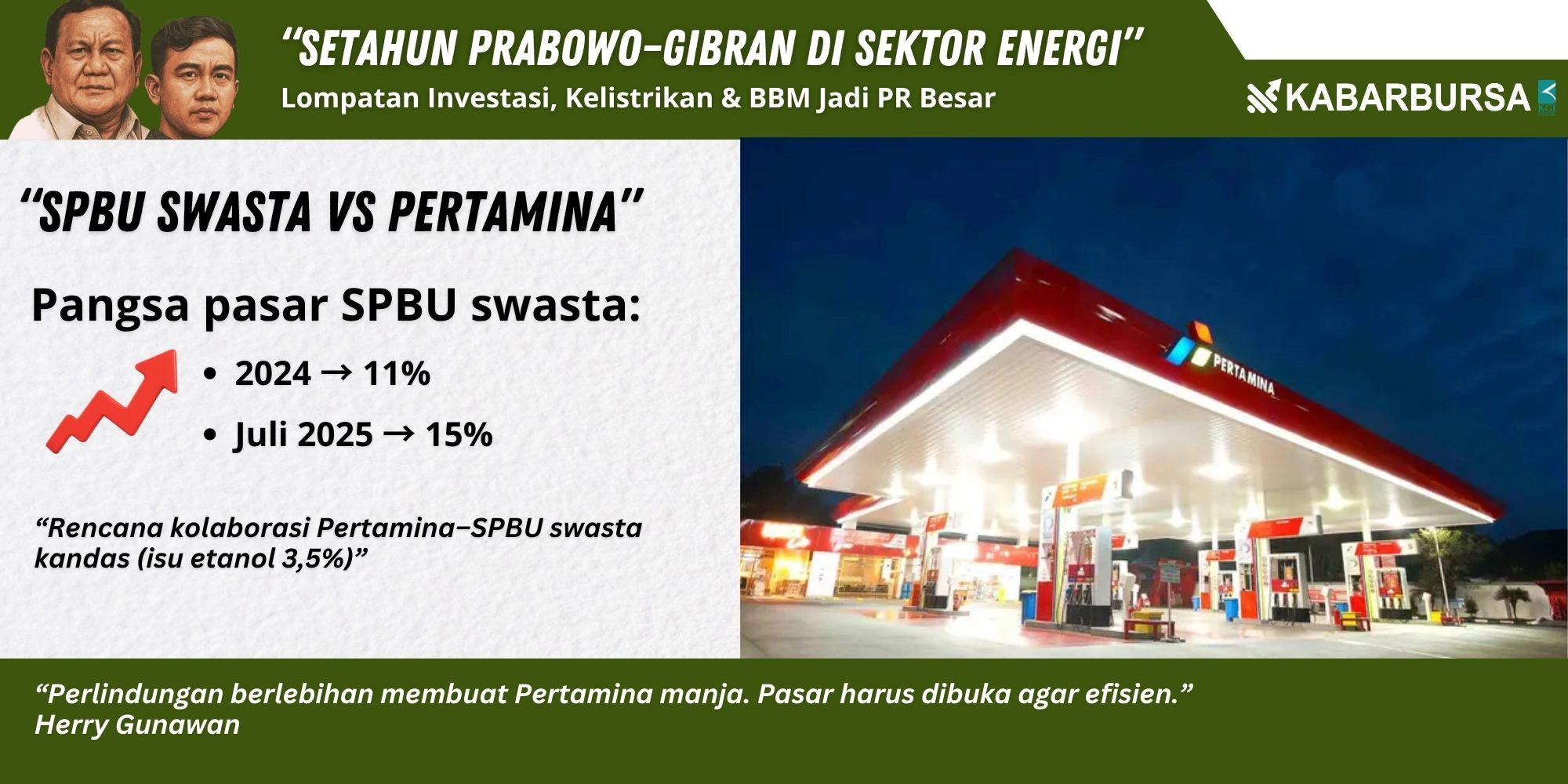 “Sebab seperti disampaikan oleh pejabat Kementerian ESDM, kekhawatirannya adalah pangsa pasar SPBU swasta yang terus naik, dari 11 persen pada tahun 2024, sudah menjadi 15 persen per Juli 2025,” kata dia kepada Kabarbursa.com, Jumat, 10 Oktober 2025.