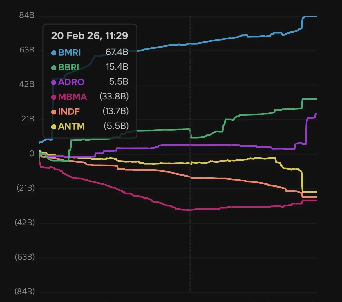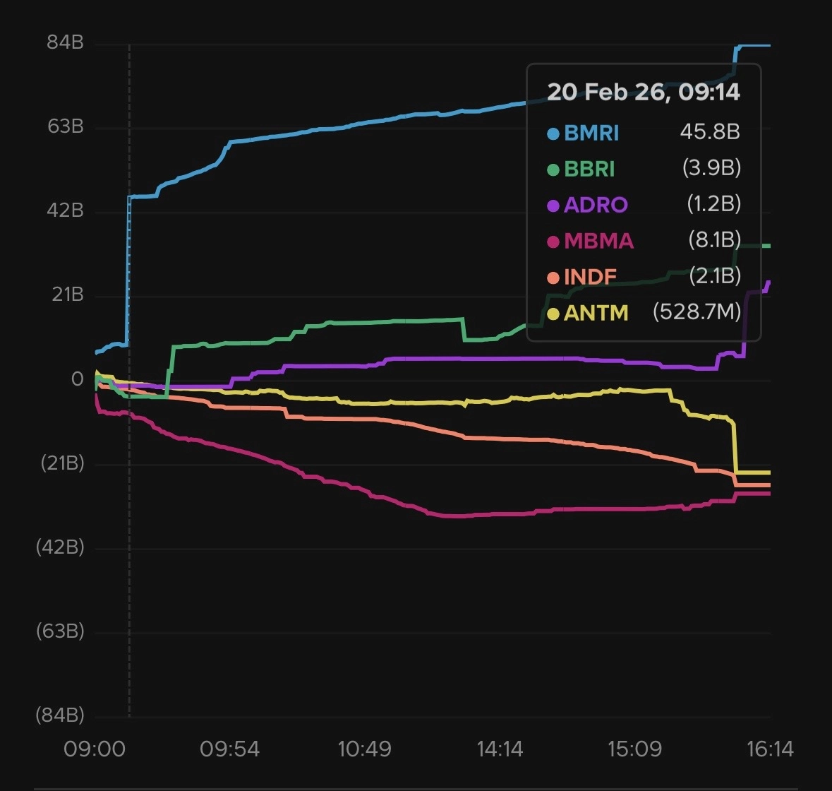 Sejak awal perdagangan, akumulasi sudah terlihat di PT Bank Mandiri Tbk (BMRI). Nilai beli bersih terus menanjak dari Rp45,8 miliar pada pukul 09.14 hingga ditutup di kisaran Rp84 miliar pada akhir sesi. Kenaikan yang nyaris tanpa jeda itu menunjukkan pola pembelian terstruktur, bukan transaksi spekulatif harian.