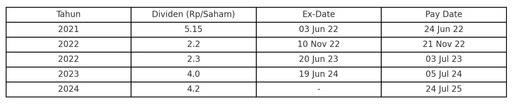 Setahun kemudian, pada 2022, dividen diberikan dalam dua tahap, yaitu Rp2,20 pada November dan Rp2,30 pada Juni. Tahun lalu, dividen kembali naik ke Rp ,00 per saham. Kini, jumlahnya meningkat tipis menjadi Rp4,2.
