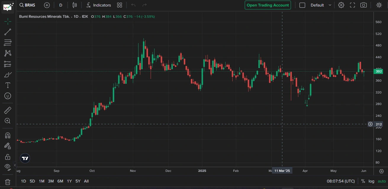 Secara teknikal, saham BRMS saat ini sedang bergerak dalam pola konsolidasi yang cukup panjang. Setelah mencetak puncak di kisaran Rp530 pada November 2024, saham ini cenderung bergerak mendatar dalam rentang Rp320 hingga Rp440.