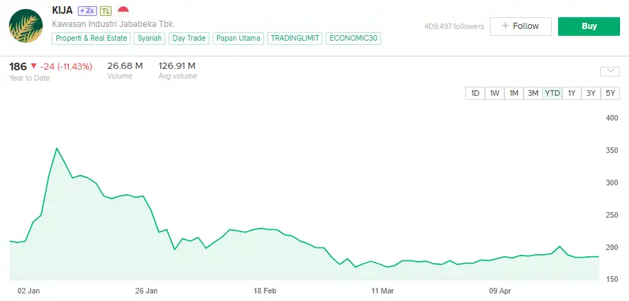 Secara tahun berjalan, saham KIJA sudah turun 24 poin atau melemah 11,43 persen.