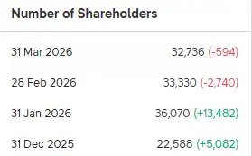 Penurunan ini terjadi setelah sempat terjadi lonjakan pada akhir 2025. Pada 31 Desember 2025, jumlah pemegang saham tercatat 22.588, naik dari 17.506 pada November 2025.