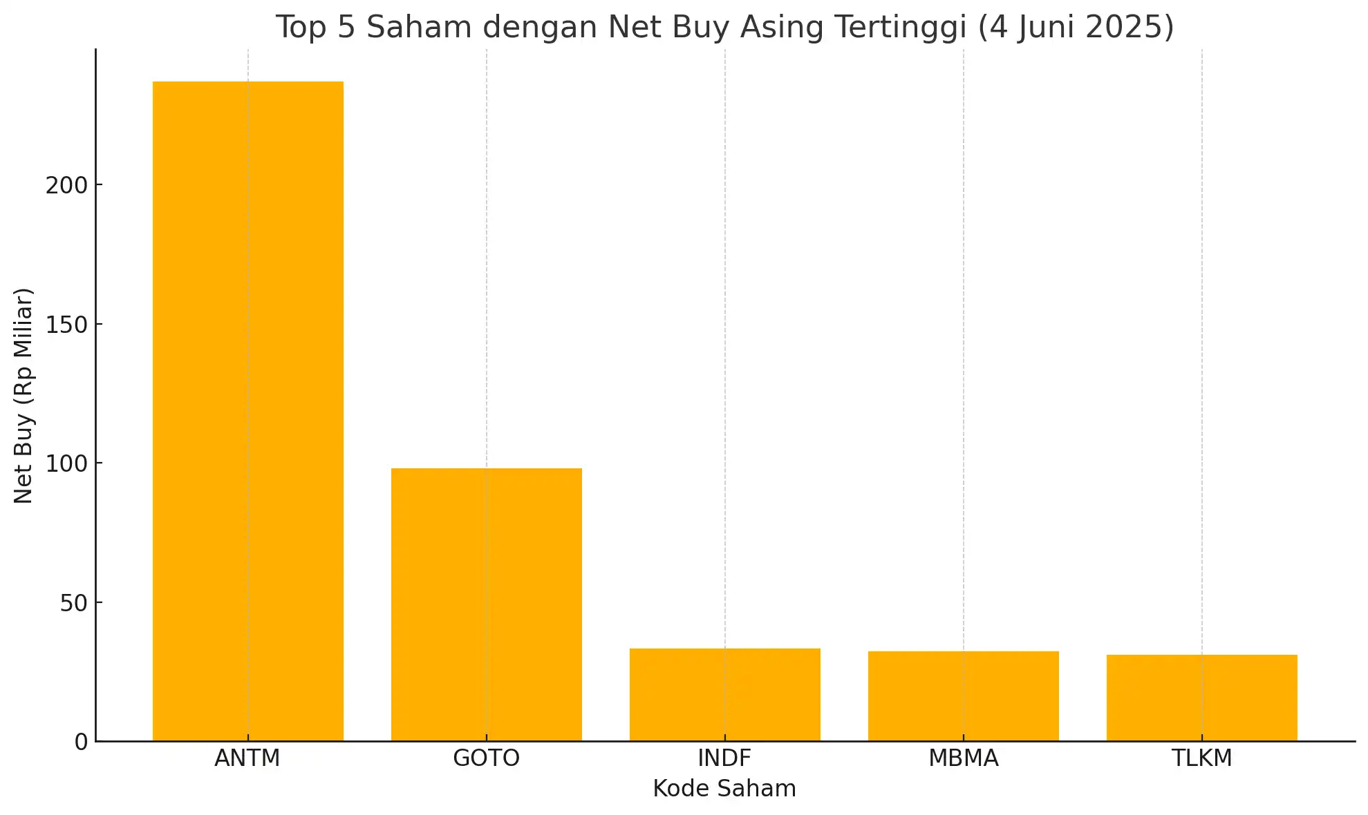 KABARBURSA.COM - Investor asing kembali mencatatkan aksi beli bersih (net buy) di beberapa saham unggulan pada perdagangan Rabu, 4 Juni 2025. Saham sektor logam, teknologi, dan konsumsi menjadi sasaran utama dana asing.