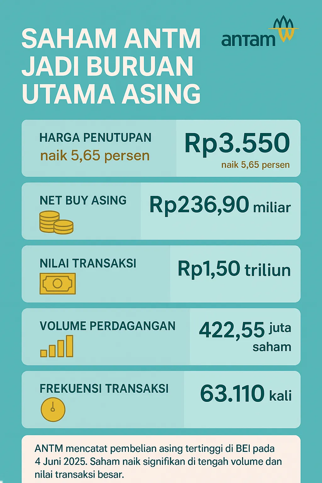 Volume perdagangan ANTM menyentuh 422,55 juta lembar saham. Frekuensi transaksi tercatat 63.110 kali dengan harga penutupan Rp3.550, naik 5,65 persen dibanding hari sebelumnya.