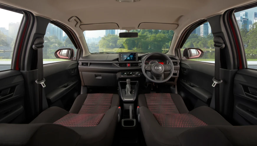 Daihatsu Ayla menawarkan kabin berkapasitas lima orang penumpang. Adapun nuansa interiornya mengusung warna serba hitam dengan dasbor yang dilengkapi MID (Multi Information Display) model kombinasi analog dan digital.